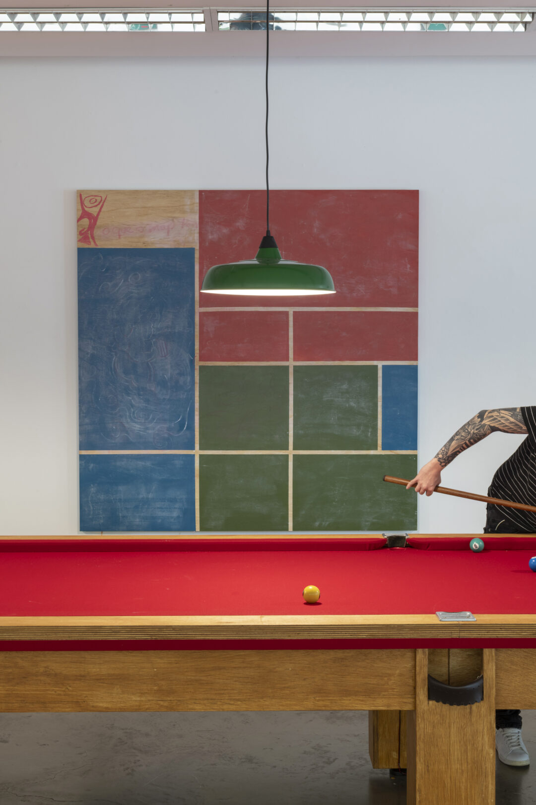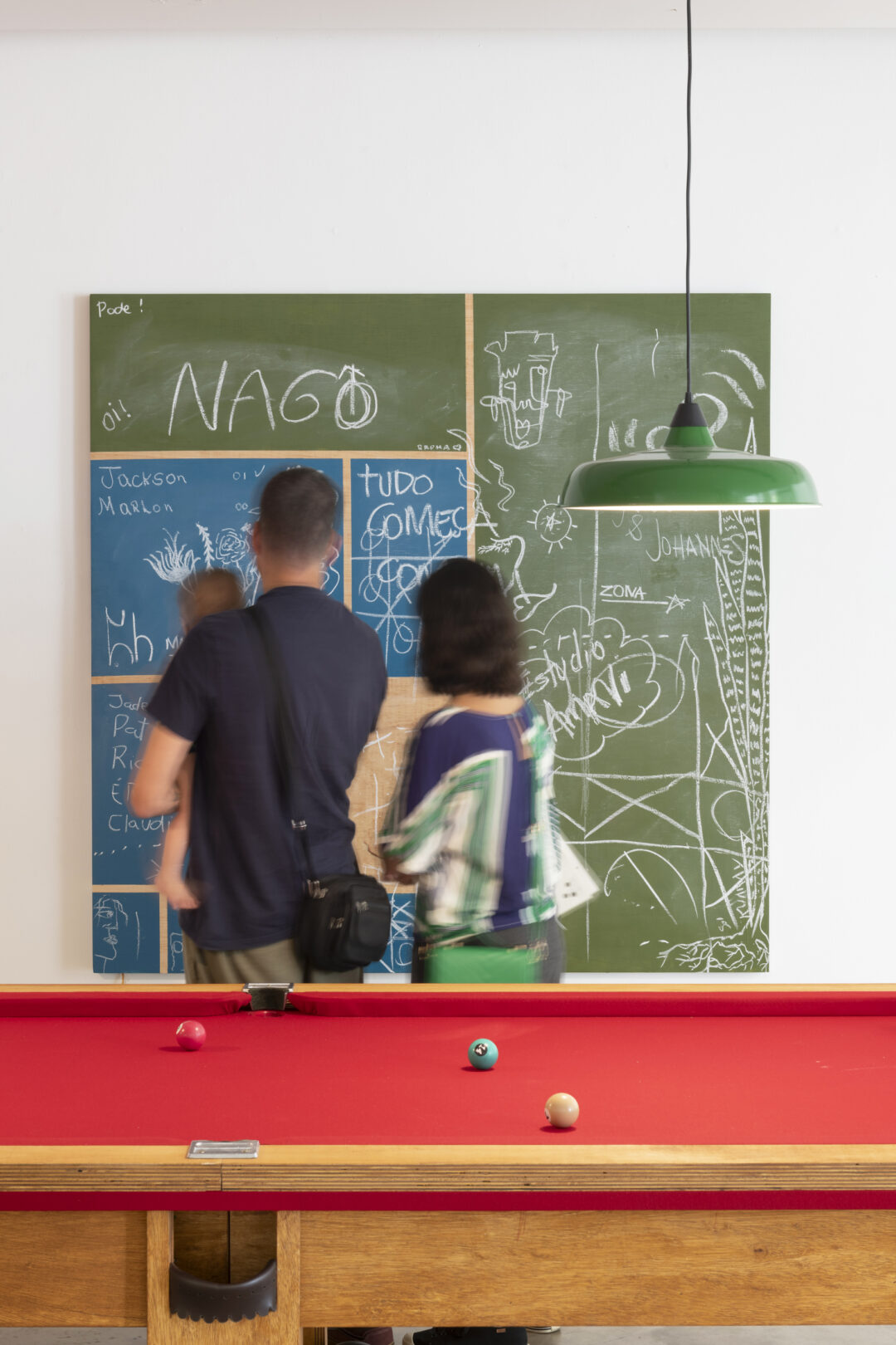 O centro da galeria é ocupado por uma mesa de sinuca vermelha de 13 metros de comprimento com o título É hora da onça beber água (2020), inspirada pelas pinturas de mesas de sinuca do artista e fotógrafo estado-unidense Man Ray (La Fortune, 1938 e 1973), do pintor holandês Van Gogh (Le Café de nuit, 1888) ou do pintor afro-americano Jacob Lawrence (Pool Parlor, 1942). As pernas da mesa escondem altifalantes que ampliam os sons do jogo através dos microfones instalados em toda a superfície. Assim as jogadas são sempre amplificadas, especialmente quando as bolas caem nos buracos. Ao alongar a mesa e usar a cor vermelha, o artista não só acentua um imaginário político particular, mas também abre espaço para a inclusividade e a coesão social. O comprimento exagerado da mesa alonga metaforicamente o tempo lúdico, enquanto monumentaliza o jogo e o convívio alegre. Froiid também cita os quadros do compositor de samba, cantor e pintor brasileiro Heitor dos Prazeres, que retratou a vida nas favelas, com jovens sambando e jogando, muitas vezes com a cabeça e a vista viradas para cima. O título da obra é uma expressão que indica um momento perigoso – quando a onça bebe água ao cair da noite, os outros animais estão em alerta.