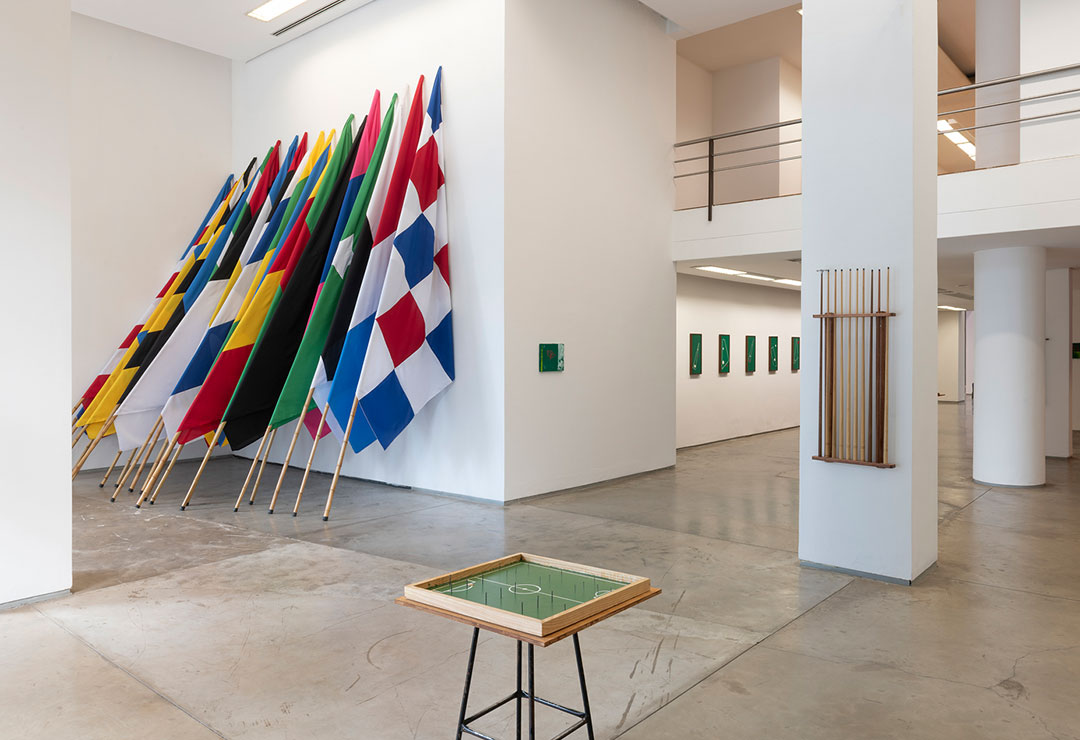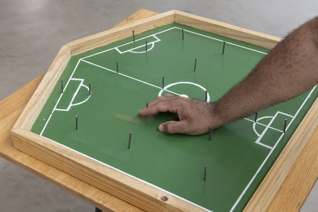 À entrada estão expostas em fila 20 bandeiras com varas de bambu de 5 metros de altura, constituindo Sapo de Fora não ronca (2022) que inclui também uma caixa de som colocada na rua, difundindo gravações de jogos de futebol e cantos e tambores de torcidas organizadas. As cores e padrões das bandeiras correspondem a emblemas de clubes de futebol locais. Três jogos de tabuleiro estão espalhados na área de entrada, prontos para serem usados. Estes Petelecos são derivados de campos de futebol e têm títulos como Cabeça de área, Zona do Agrião, ou Ai o bambu quebrou no meio, os quais aludem às formas recortadas dos tabuleiros e às assimetrias que favorecem uma das partes. Duas impressões fotográficas multiplicam as jogadas La mano de Dios (Maradona, Copa do Mundo, 1986) e Drible da Vaca (Pelé, Copa do Mundo, 1970) criando padrões geométricos em preto-e-branco, acompanhados dos vídeos das respetivas jogadas em loop. O histórico gol de Maradona pela Argentina que ele denominou como uma vingança simbólica contra a Inglaterra devido à Guerra das Malvinas (1982), e o histórico não-gol de Pelé pelo Brasil, apelidado o gol que não foi, mas deveria ter sido. Estes dois ídolos ocupam espaços legendários, míticos, que apelam ao imaginário coletivo do povo.
