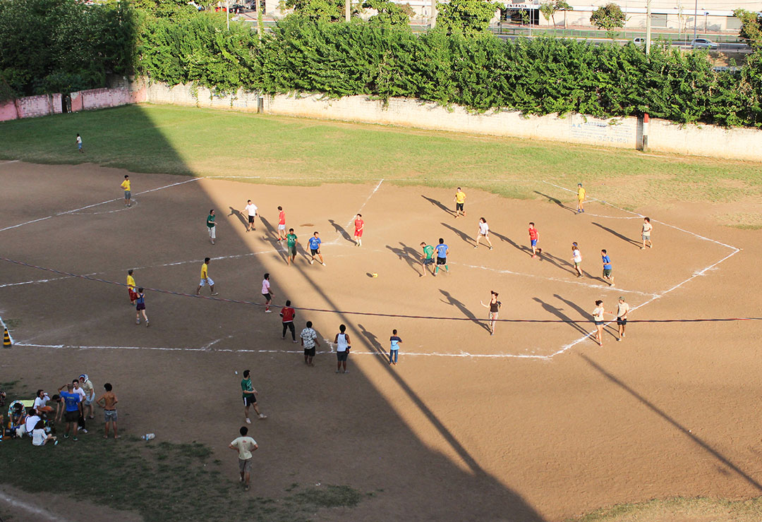 A exposição fecha com uma fotografia que retrata um campo de futebol em terra batida. Vemos apenas o canto. Uma pedra marca a esquina e as linhas são desenhadas com cal. O saco de cal aberto está jogado no chão e as linhas estão já esbatidas, misturadas com a areia, como consequência do jogo que aconteceu. A força da fotografia está na forma como ela consegue encapsular o espírito sonhador e competitivo de tantas crianças e jovens com pouco acesso. No jogo, tudo é possível – é só preciso um pouco de cal e já a terra batida se transforma num verdadeiro campo de futebol. A força que se encontra dentro desse gesto é grande demais para caber numa foto e então se expande para todo o espaço em volta.
