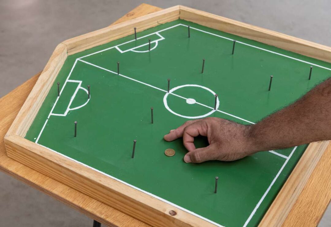 As múltiplas narrativas que Froiid tece ao conceber esta exposição – que não é apenas um espaço físico, mas igualmente emocional, mental, imaginário – encontram-se profundamente enraizadas na cultural popular brasileira. Em conjunto, elas constroem um espaço para o convívio e o lazer, para o jogo e para a malandragem. O artista invoca um universo maioritariamente masculino, onde coexistem as apostas e o vício, o vagar e a competição, a sorte e o azar. Entramos em Mundaréu e somos instantaneamente implicadas/os através dos convites abertos ao jogo. Entramos em Mundaréu e somos envolvidas/os por uma amálgama de sons ecléticos. Entramos em Mundaréu e assim fazemos parte de uma homenagem afetuosa aos espaços de partilha da classe trabalhadora. Com um aceno ao escritor, ator, jornalista e dramaturgo Plínio Marcos (1935-1999) e as suas Histórias das quebradas do mundaréu (1973), Froiid conecta futebol e sinuca, política e inteligência artificial, ícones e ditados populares. À entrada estão expostas em fila 20 bandeiras com varas de bambu de 5 metros de altura, constituindo Sapo de Fora não ronca (2022) que inclui também uma caixa de som colocada na rua, difundindo gravações de jogos de futebol e cantos e tambores de torcidas organizadas. As cores e padrões das bandeiras correspondem a emblemas de clubes de futebol locais.