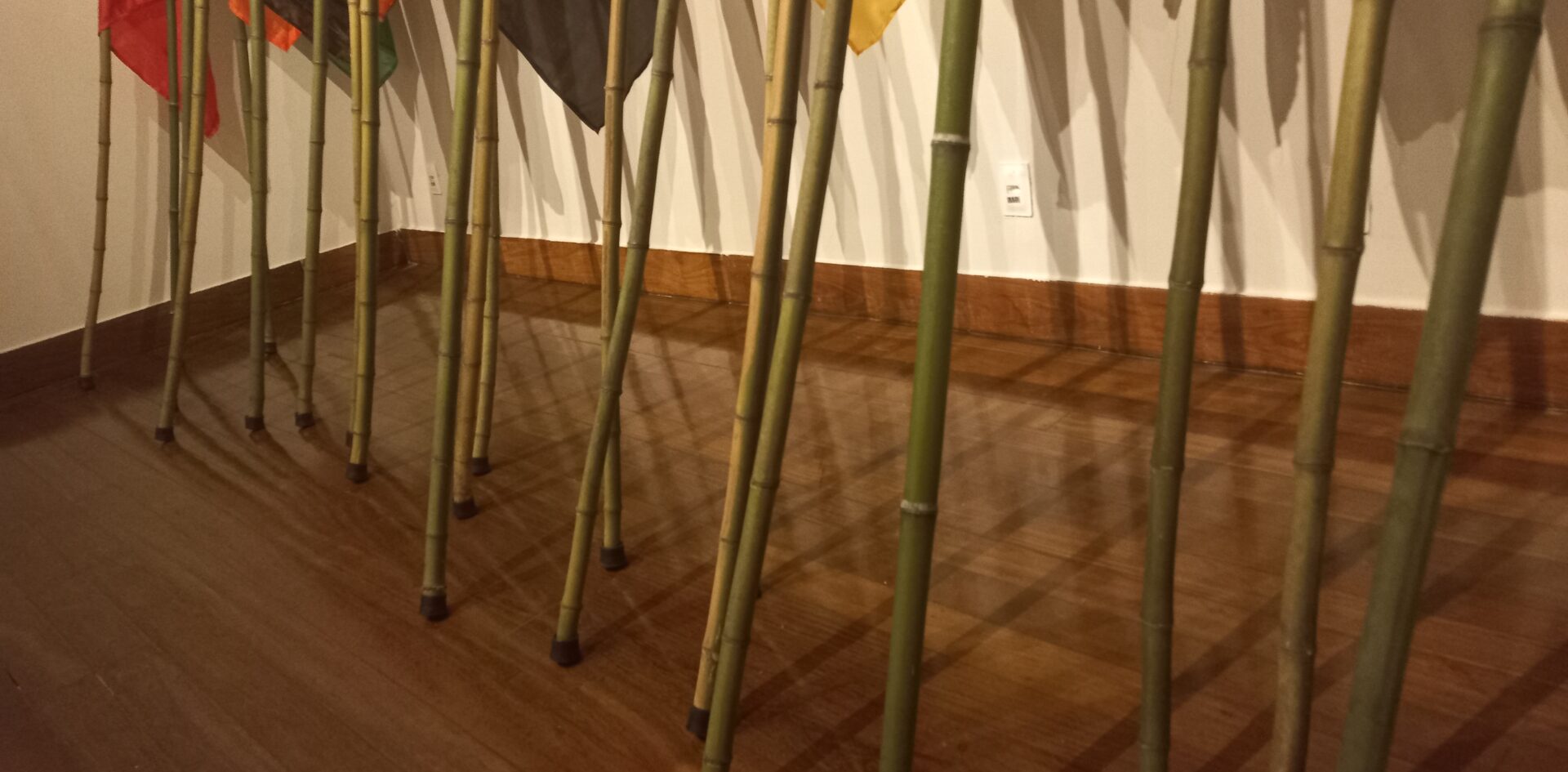 Fiz um estudo de cores e formas mais utilizadas nos brasões para compor um jogo de bandeiras de 2 metros de tecido e são aplicadas em mastros de bambus de 4 metros. O trabalho ainda compõe um áudio de cantos e tambores gravados e posteriormente mesclados de diversas torcidas, além de sons de jogos, formando uma peça sonora continua.